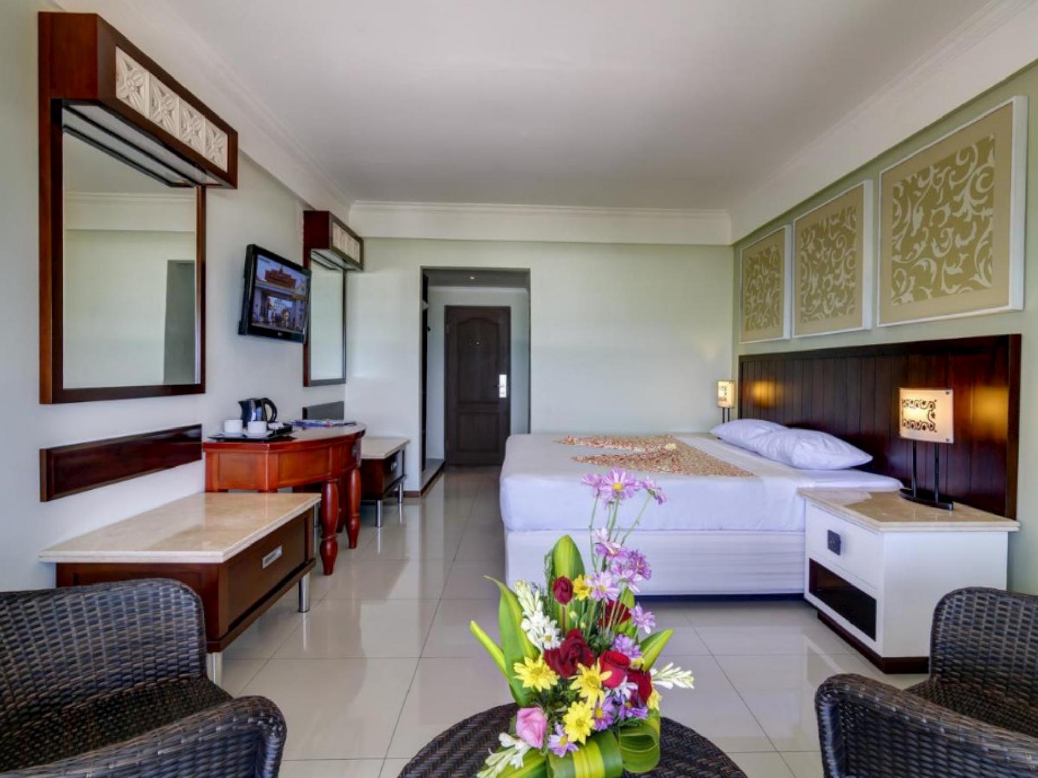 Kamar-kamarnya yang ber-AC dilengkapi dengan area tempat duduk serta menampilkan perpaduan antara perabotan modern dan tradisional Indonesia. Semua kamar menawarkan TV layar datar, brankas pribadi, dan kulkas. Kamar mandi pribadinya memiliki fasilitas bathtub dan shower.